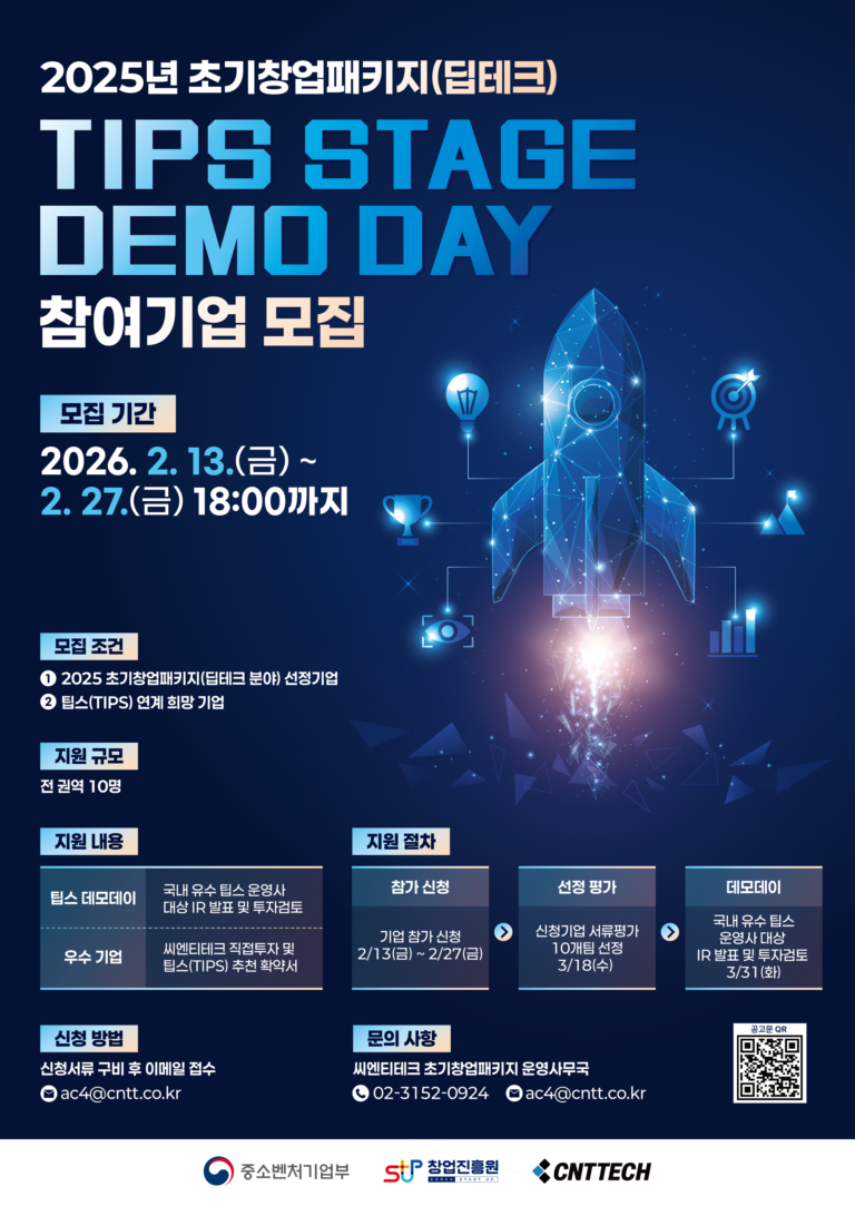 • 씨엔티테크, ‘TIPS 스테이지 데모데이’ 참가기업 모집(~2월27일)