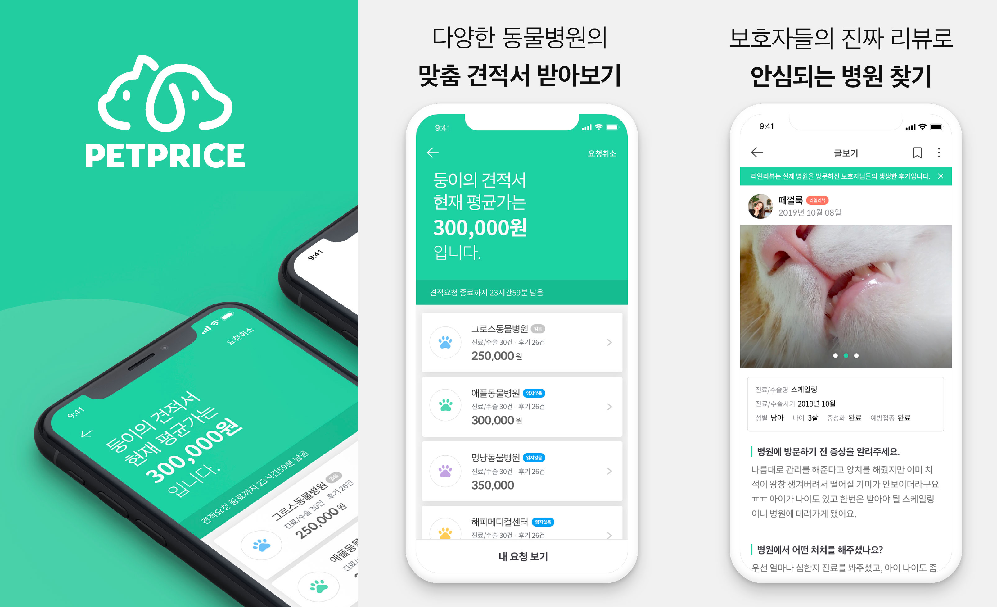 특히, 수의사 경력, 병원 위치 및 시설 등에 따른 여러 견적을 한 번에 받아보고 비교할 수 있으며, 해당 병원에서 진료받은 후기도 확인할 수 있다. 펫프라이스는 출시 9개월만에 서비스 가입자 1만 명, 견적서 발송 건수 1만 건을 달성하였으며, 펫프라이스를 통해 전국 약 1/3의 동물병원으로부터 반려동물 보호자들에게 견적서가 발송되었다.