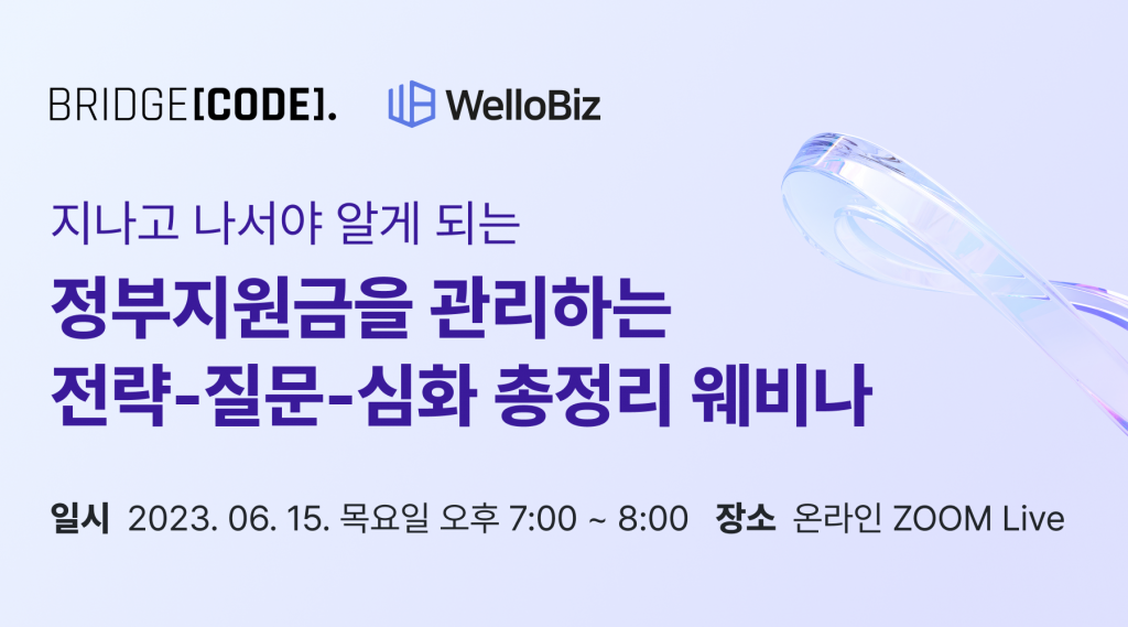 브릿지코드는 올인원 정부사업관리 SaaS 서비스 웰로비즈와 함께 이번 ‘정부지원금 관리 전략-질문-심화 총정리 웨비나’를 통해 기업에 정부지원사업 신청, 정부지원금 관리 전략 및 사용 방법에 이르는 핵심 정보를 제공할 예정이다. 이번 웨비나는 온라인 줌 라이브(On-line ZOOM Live)를 통해 개최된다.